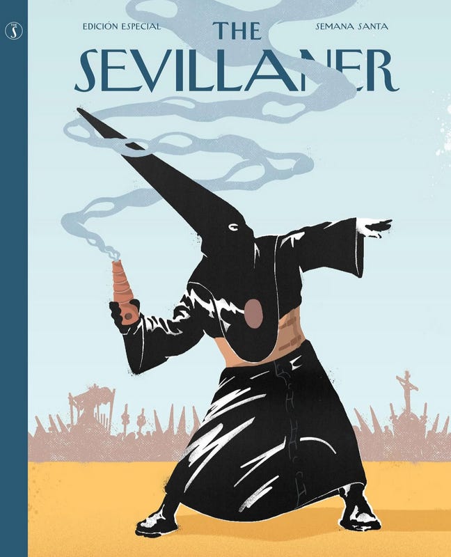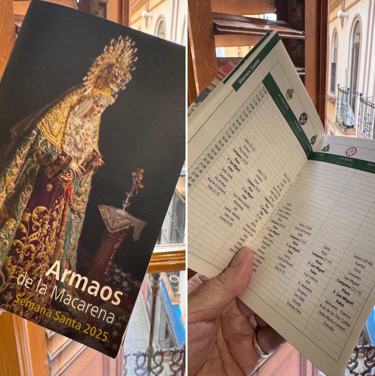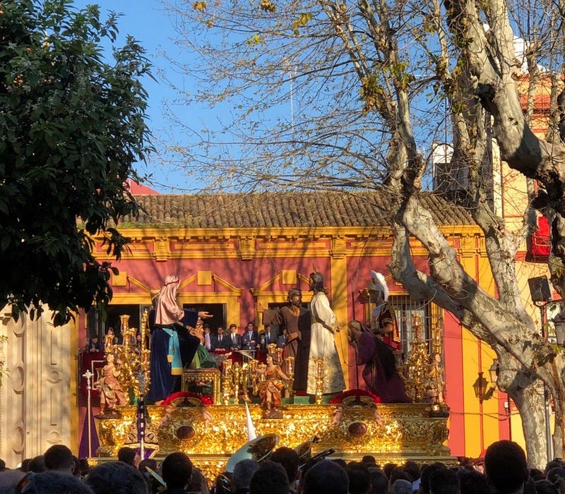 I don't get out much during Semana Santa anymore, not since a couple of years before Covid started. It was starting to feel a bit too much, even for something that has always been over the top. But before it was over the top in its own distinctly sevilliano way. The heaving crowds, the long waits, the bustling between processions to see your favourite ones at the optimum location. Even today I looked out over my balcony and saw a group of well-dressed people about my age standing on the corner and looking at their little Semana Santa programmes, the ones we can pick up at any bar, deciding on where they were going to go next.