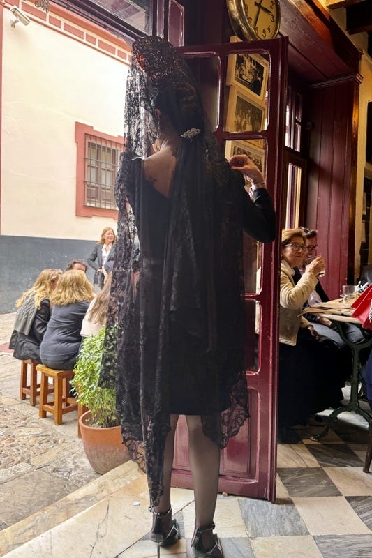 Anyhow, today I went out mantilla hunting... love seeing the women dressed on Maundy Thursday and Good Friday, so elegant with their black lace mantillas draped over a tall tortoise shell comb. I especially love the older women (some of the younger ones are in tight black mini-dresses with cut-away fronts like... wtf??). The idea is that the women are in mourning because Christ has died, which is a lovely tradition when done properly.